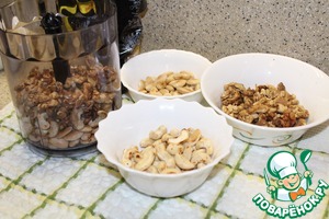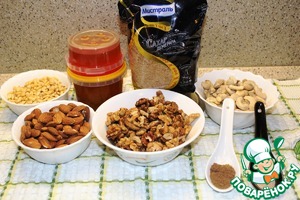 Продукты. Я готовила половину порции. В оригинальном рецепте, кроме перечисленных орехов, предлагается еще использовать фундук, но у моего мужа аллергия на этот орех, поэтому мне пришлось отказаться от него. Общее количество орехов сохранено, просто порция фундука (200 г) разделена между другими орехами.