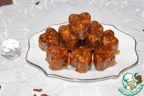 Я испробовала три варианта раскладки ореховой массы. Первый, согласно рецепту, смазала форму растительным маслом, уложила слой толщиной приблизительно 1,5 см, разровняла, сверху промасленную пекарскую бумагу. Второй (самый провальный) уложила массу в форму, выстланную фольгой, ей же и прикрыла. В третьем варианте, решила сделать в форме конфет, и воспользовалась силиконовой формой.