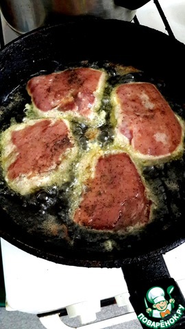 А затем натираем его по вкусу солью, перцем и обмакиваем в яйце, затем жарим его в масле-у меня оливковое-до золотистой корочки.