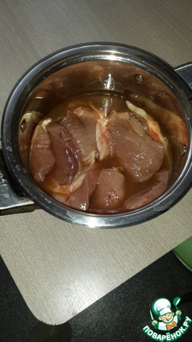 После маринования мяско достаем и прокалываем часто-часто вилкой