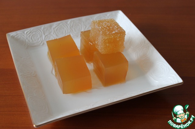 6. Форму застелить пищевой пленкой. Вылить получившуюся смесь ровным слоем и дать застыть при комнатной температуре. Вынуть мармелад из формы. Мармелад готов к употреблению. Также его можно обвалять в сахаре, но чтобы он не сильно отмокал, лучше подсушить мармелад еще в течение суток при комнатной температуре на решетке и только после этого обвалять в сахаре. Он немного со временем отмокнет (после этого нужно будет обвалять еще раз), но уже не так сильно, как если его обвалять без дополнительной сушки.