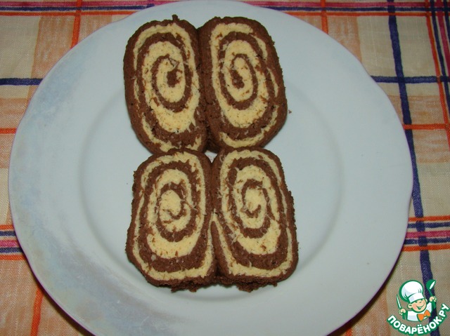 Поочередно раскатать тесто (я раскатывала на бумаге для выпечки) в пласт примерно 30*25. Наложить один пласт на другой, плотно прижать скалкой и свернуть рулетом.