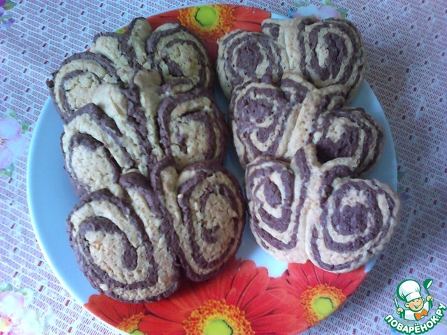 Выложить их на бумагу для выпечки (смазанную маслом), придать форму бабочки-слегка придавив в центре и расправить усики. Выпекать до зарумянивания печенья при t= 180 С, примерно 15-20 минут.