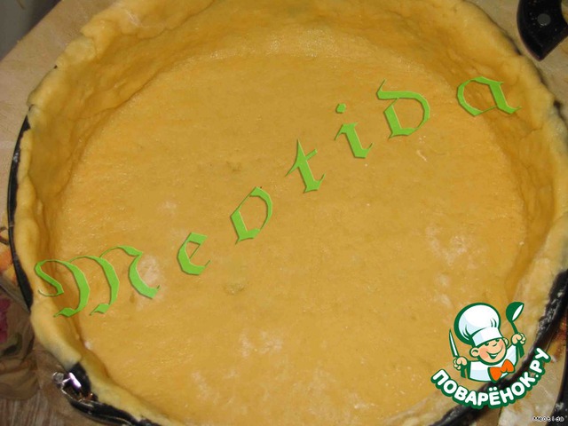 • Выложить в форму большой кусок теста и хорошо разровнять, чтобы закрыть бортики, излишки теста удалить