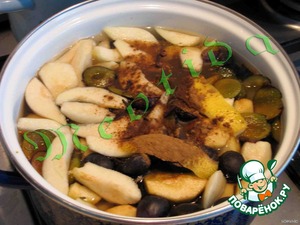 • Фрукты сложить в кастрюльку, добавить корицу, гвоздику, цедру, сахар, залить водой. Накрыть крышкой и готовить на небольшом огне минут 10, пока яблоки не станут размягчаться. Снять с огня, откинуть фрукты на дуршлаг, а жидкость вернуть в кастрюльку, поставить на огонь и закипятить. Фрукты и компотик остудить.