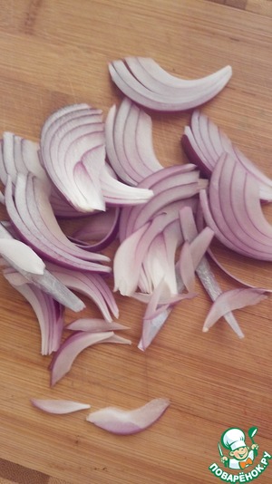 Лук режем тонкими дольками и маринуем в винном уксусе минут 20.