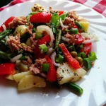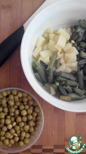 Вареный картофель режем средним кубиком, добавляем стручковую фасоль (предварительно бланшируйте ее в кипящей воде около минуты, затем сразу же ополосните холодной водой) и зеленый горошек