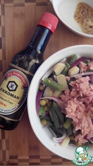 Соус: смешиваем соевый соус, оливковое масло и горчицу (я взяла двух видов - обычную и французскую).