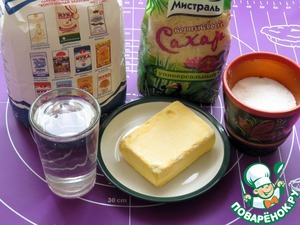 Просеянную муку и сливочное масло рубим ножом. В холодной кипячёной воде разводим сахар и соль, добавляем в муку с маслом и быстро замешиваем эластичное тесто.