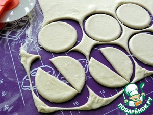 На раскатанном тесте вырезаем круги. Я вырезала обычным стаканом. Каждый круг разрезаем пополам.