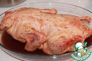 Утка или гусь, прекрасное блюдо праздничного стола. Секрет успеха - маринад, который в данном рецепте на основе соевого соуса. А начинкой для нашей уточки послужат ягоды.