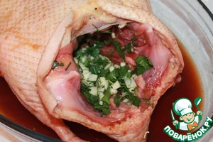 Внутрь утки кладем чеснок и зелень и оставляем мариноваться не менее, чем на 12 часов. Периодически переворачиваем утку.