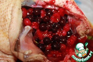 После того, как уточка замариновалась, внутрь тушки кладем подсоленную ягодную смесь. Зашиваем утку в районе гузки и шеи. Отправляем в духовку на 200 - 220 град. на 1, 5 часа, укрыв утку фольгой, а затем еще на 1 час, сняв фольгу, до готовности.