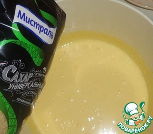 Приготовим тесто. Яйца необходимо разделить на желтки и белки. Желтки растереть с тростниковым сахаром добела. Затем добавляем ванильный сахар и еще раз хорошо взбиваем.
