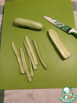 Огурец очищаем от кожицы и нарезаем длинными брусочками.