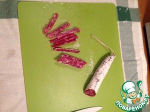 Колбаску фуэт так же нарезаем брусками, конечно же подойдёт и любая другая сыровяленная колбаса.