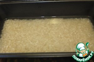 Выкладываем его в форму для запекания и заливаем водой. Вода должна покрывать рис и быть выше его уровня примерно на 5 мм. -