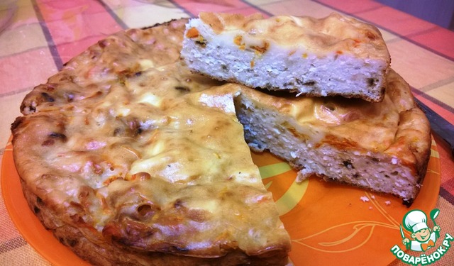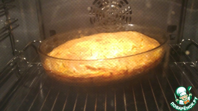 Залить оставшимся тестом. Выпекать в духовке, заранее разогретой до 190 градусов, 50 минут.
