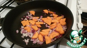 Морковь порежем полукольцами и отправим к слегка обжаренному луку. -