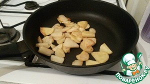 Индейку снять с огня. Если вы любите грибы - их отправить в сковороду следующим шагом минут на 10, не более, добавить к обжаренному картофелю. Этот шаг можно и опустить.