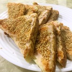 Срежьте края у тостов и намажьте креветочным фаршем, потом обмакните в кунжут.