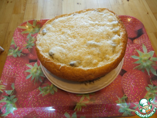 Хлеб ставим на противень, высыпать в середину половину грибов. Выложить курочку и высыпать оставшиеся грибочки. Поверхность выровнять.