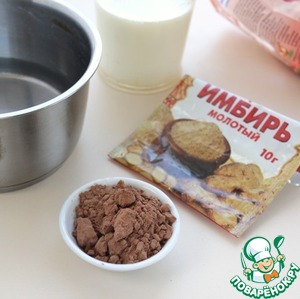 В сотейнике смешать имбирь, какао, молоко, горячую воду, довести смесь до кипения на малом огне, затем огонь убавить до минимума, варить помешивая 1-2 минуты.