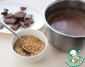 Сотейник снять с огня, всыпать сахар коричневый от Мистраль, добавить поломанный на кусочки шоколад, хорошо перемешать, чтобы сахар и шоколад растопились.