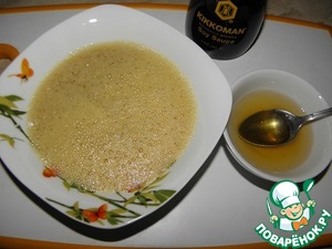 • Мед размешать с вином, яйца взбить с соевым соусом, все вместе перемешать.