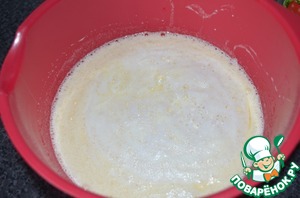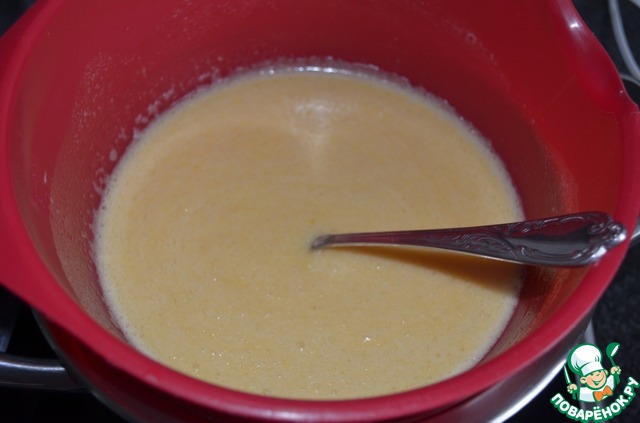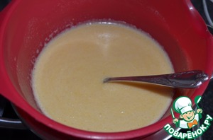 Добавить в яичную массу гащеную соду и растопить на водяной бане, примерно 15 минут. Масса должна увеличиться в объёме (надо постоянно помешивать). Добавить растоплённое, охлаждённое масло, перемешать.