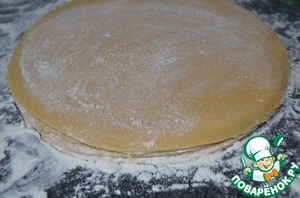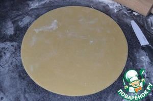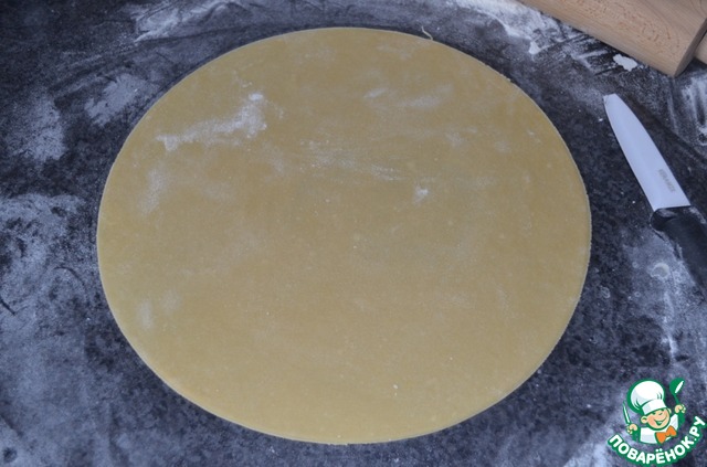 Брать по одной части и раскатывать лепёшку, 28 см. в диаметре. Чтобы не прилипало, присыпать мукой.