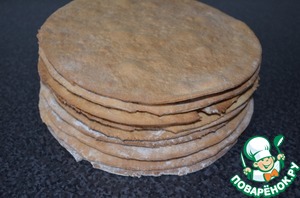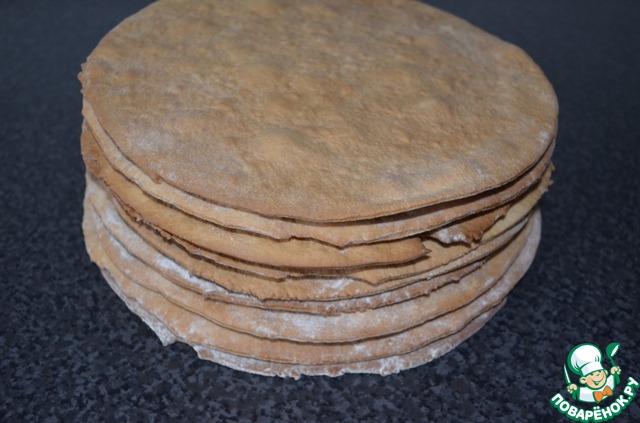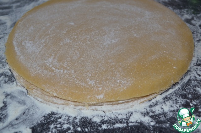 Ложить одну лепёшку на другую, присыпая хорошо мукой.