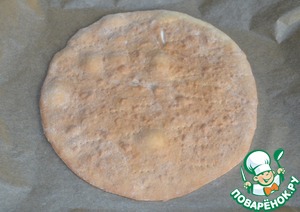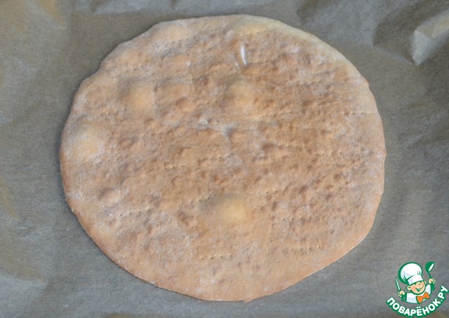 Раскатанную лепёшку положить на лист, проткнуть много раз вилкой и выпекать в духовке при 180 градусах, до золотистого цвета. Пекутся очень быстро!