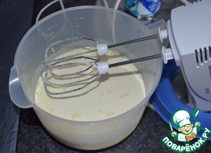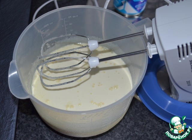 Взбивая сливки постепенно добавить сахар, сгущённое молоко и загуститель для сливок. Взбить до крепкого крема, но не до масла. Крем должен быть однородной массой! -