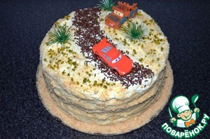Верх и бока торта, тоже смазать хорошо кремом. Я попыталась сделать с помощью ложки дорогу для машин и ямки.