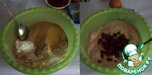 Смешать в миске сухие ингредиенты - просеянная мука, кэроб, разрыхлитель, сахар, ванильный сахар. Добавить вяленую вишню. перемешать.
