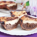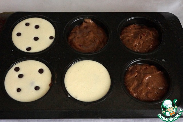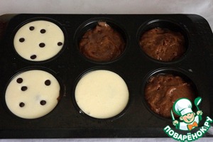 • В смазанную маслом форму для кексов кладем по 1-1,5 стол. ложки шоколадного теста, сверху добавляем 1-1,5 ст. ложки сырной заливки и шоколадные капли (или кусочки шоколада).