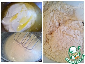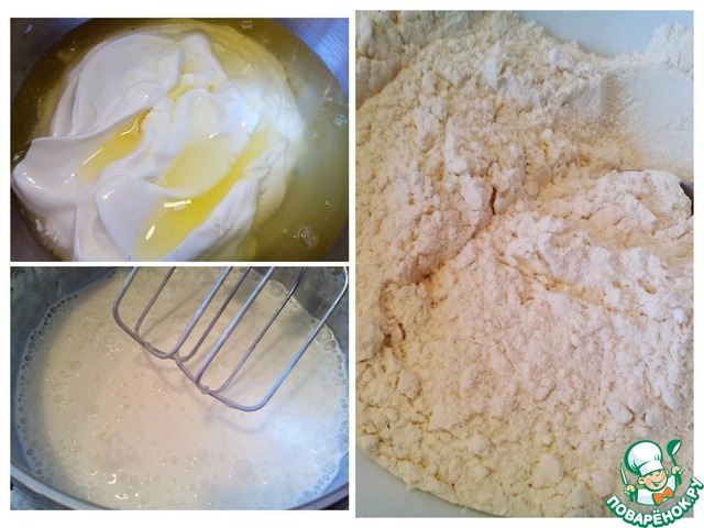 Просейте вместе муку, разрыхлитель и соль. В отдельной миске взбейте сметану с яичными белками до однородности.