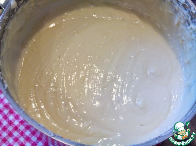 Продолжая взбивать, добавляйте небольшими порциями поочередно мучную и сметанную смеси. После того как все будет добавлено взбивать тесто еще пару минут.