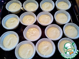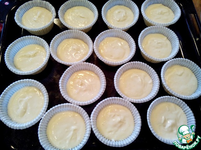 Подготовьте формочки для выпечки и наполните их на 3/4 тестом (у меня жесткие бумажные формочки диаметром 5 см).