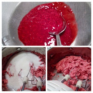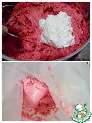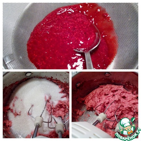 Затем также продолжая взбивать добавляйте к малиновой массе по одной столовой ложке взбитые сливки.