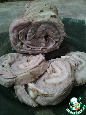 Вот уже готово. Счас сниму нитку и нарежу. (Кстати, тот бульёнчик, который остался в рукавах-не выливайте-шикарный холодец! Нежный, прозрачный)