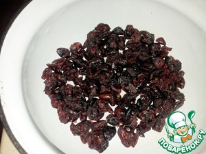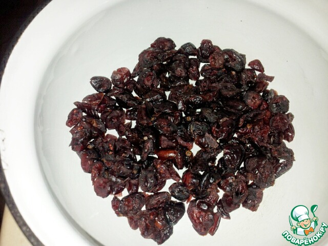 Первым делом кипятим воду и заливаем сушеную клюкву и смело можем преступать к десерту