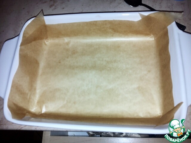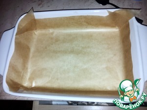 Форма у меня керамическая, высокая, примерно 26-19, застилаем пергаментом, бортики тоже