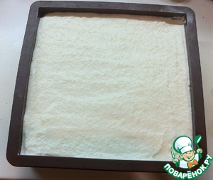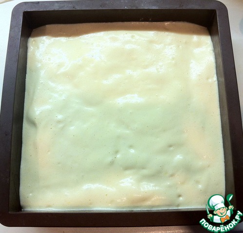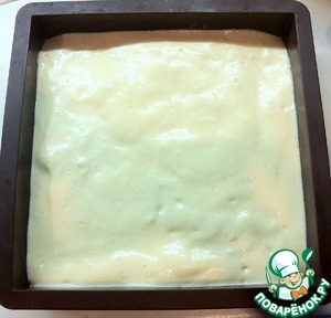 Выложить тесто в форму 22*22 см. Если форма силиконовая, смазывать её не надо. У обычной формы нужно смазать лишь дно. Выпекаем при 180 градусах 20 минут. Ориентируйтесь по своей духовке.