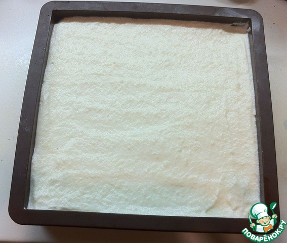 Не прекращая взбивать, тонкой струйкой вольём его в крем. Выложим бисквитный корж обратно в форму, поверх него распределим крем. Дадим застыть в холодильнике.