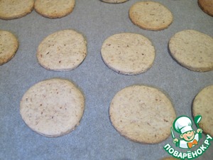 Духовку включаем на разогрев t 200-205 градусов. Тесто раскатаем в пласт, толщиной примерно 1 см. Вырежем нужное количество кругов ( 10 см в диаметре) Выложим заготовки на противень, застеленный бумагой. Выпекаем печенье около 15-ти минут или до зарумяниваия.