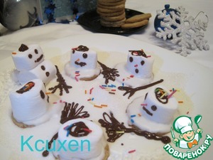 Собираем пирожные-печенья. На горячем печенье распределим глазурь, имитируя таяние снеговика. Голова снеговика-это маршмеллоу. Украшаем по своему вкусу. Я использовала шоколад, растопленный на пару и цветную посыпку. Можно использовать мелкое цветное драже.