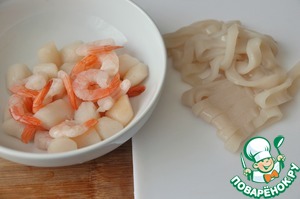 Креветкам и гребешку даём оттаять при комнатной температуре.