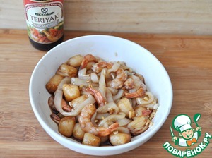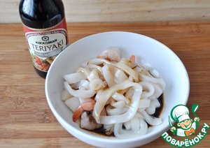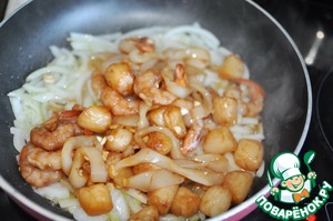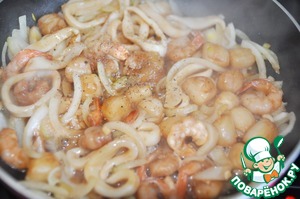 Морепродукты слегка отжимаем от маринада и кладём на сковороду, тушим 5 минут, помешивая.
